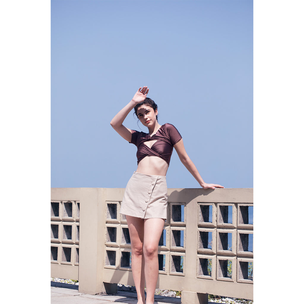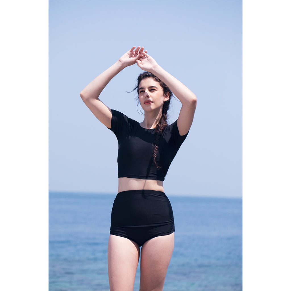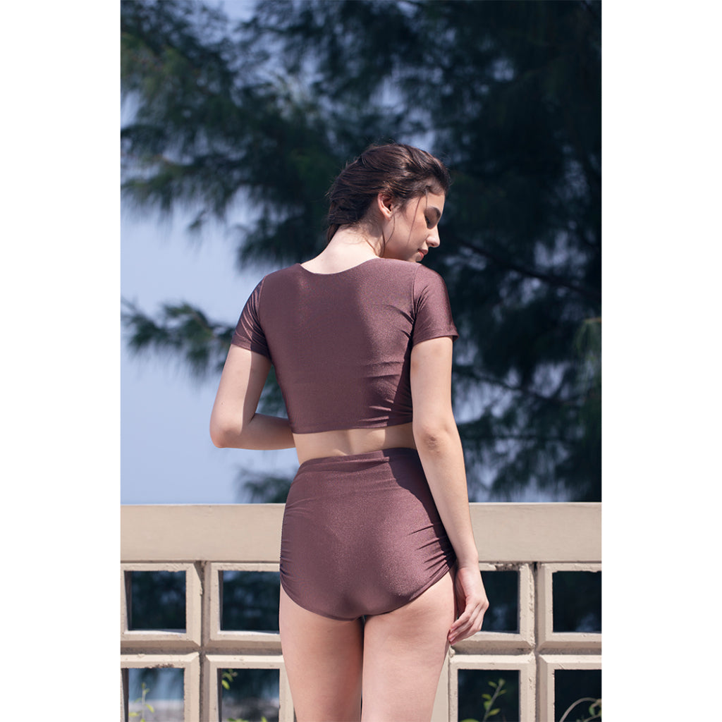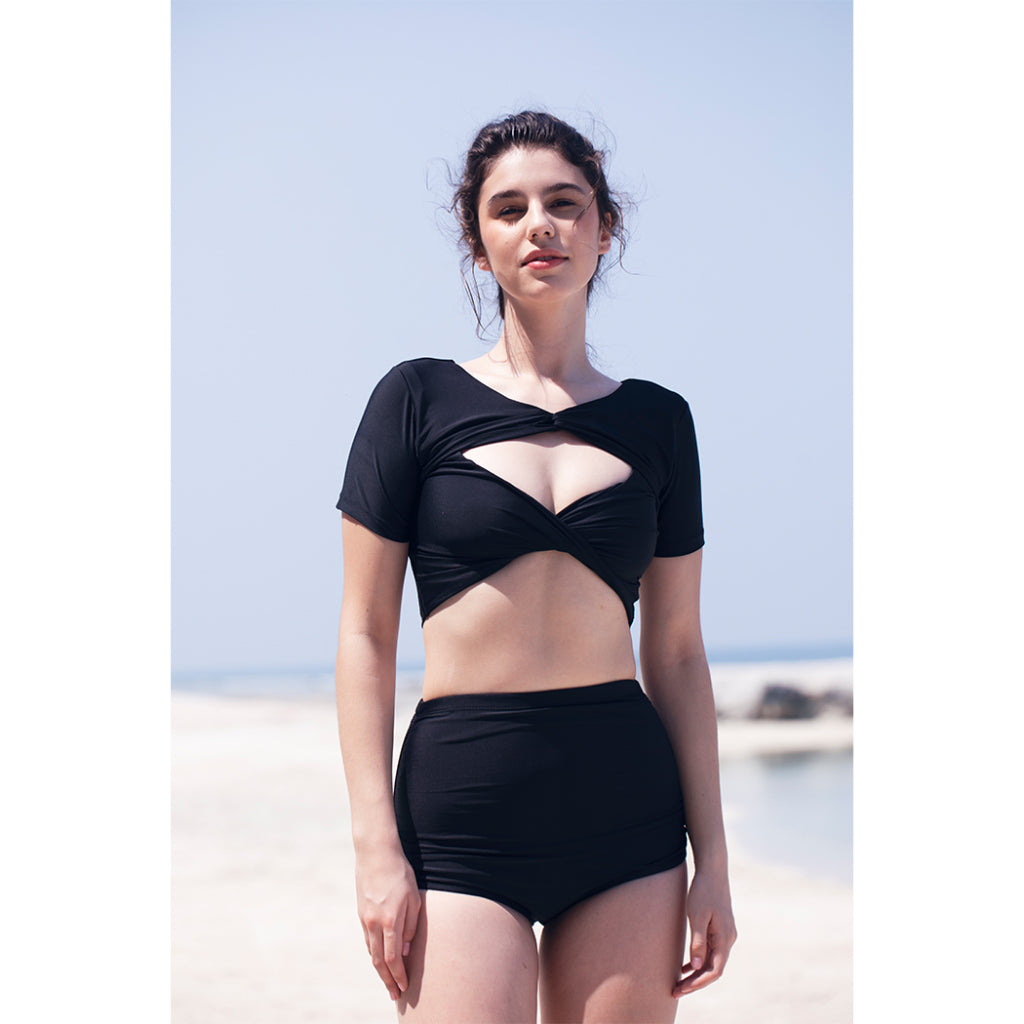 Featuring KEROKOO X ELXI ELVINA's EL CAMBON COLLECTION, this bikini offers a unique short-sleeved and diamond cut out top that can be worn two ways.