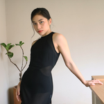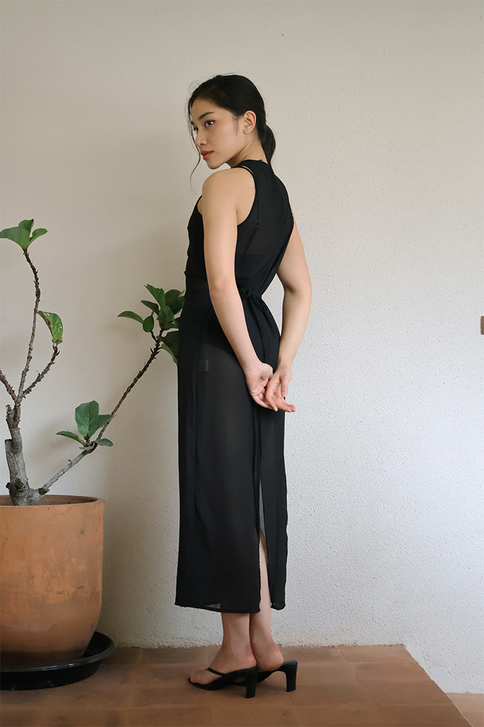 Crew neckline detail with midi length, sleeveless cutting and an adjustable waist tie for a flexible fit.
