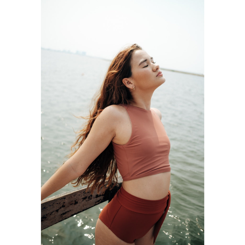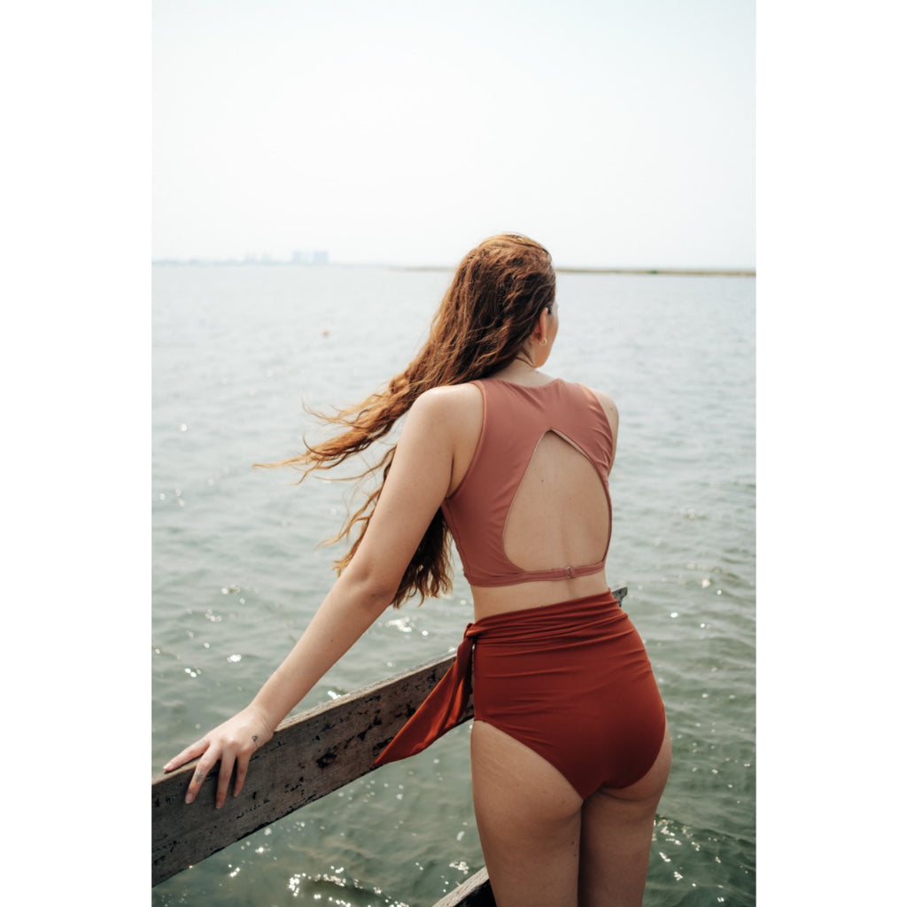 This is a classic silhouette bikini featuring a halter top and high waisted bottom. It also includes a hand tied belt at the waist for a touch of edginess, as well as a cut out at the back of the top.